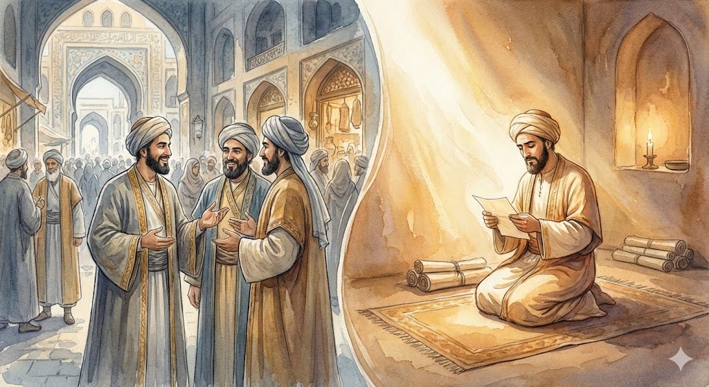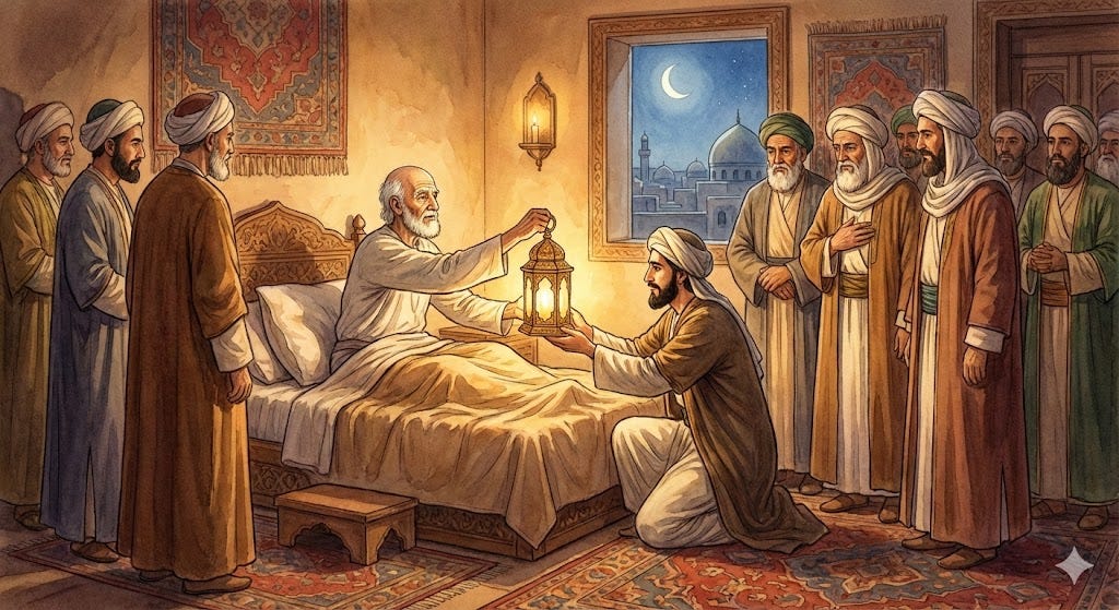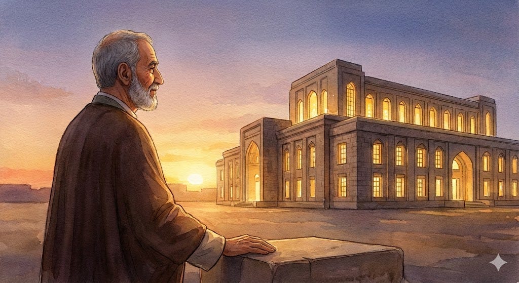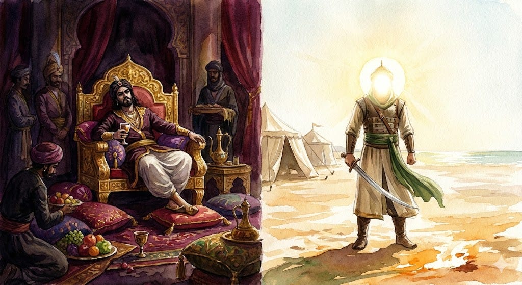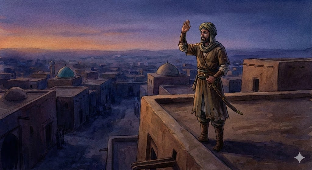 He stood on that rooftop, and he turned — not toward Makkah, but toward the desert. Toward the road from which the caravan of Imam Husayn was approaching.