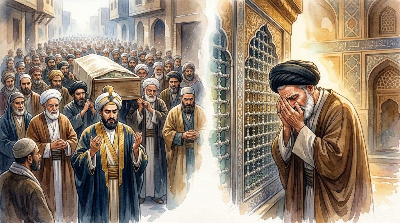 Not a scholar of Sayyed al-Radhi’s school, not a jurist, not an Alid — but the chief minister of the government itself, stepping forward to lead the funeral prayer over one of the greatest Shi’i scholars of the age, because the dead man’s own brother could not bear to.