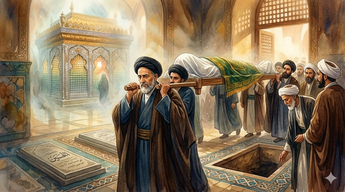 The son of Sayyedah Fatimah — through a lineage stretching across centuries — returned, at the last, to the side of the son of Sayyedah Fatimah himself.