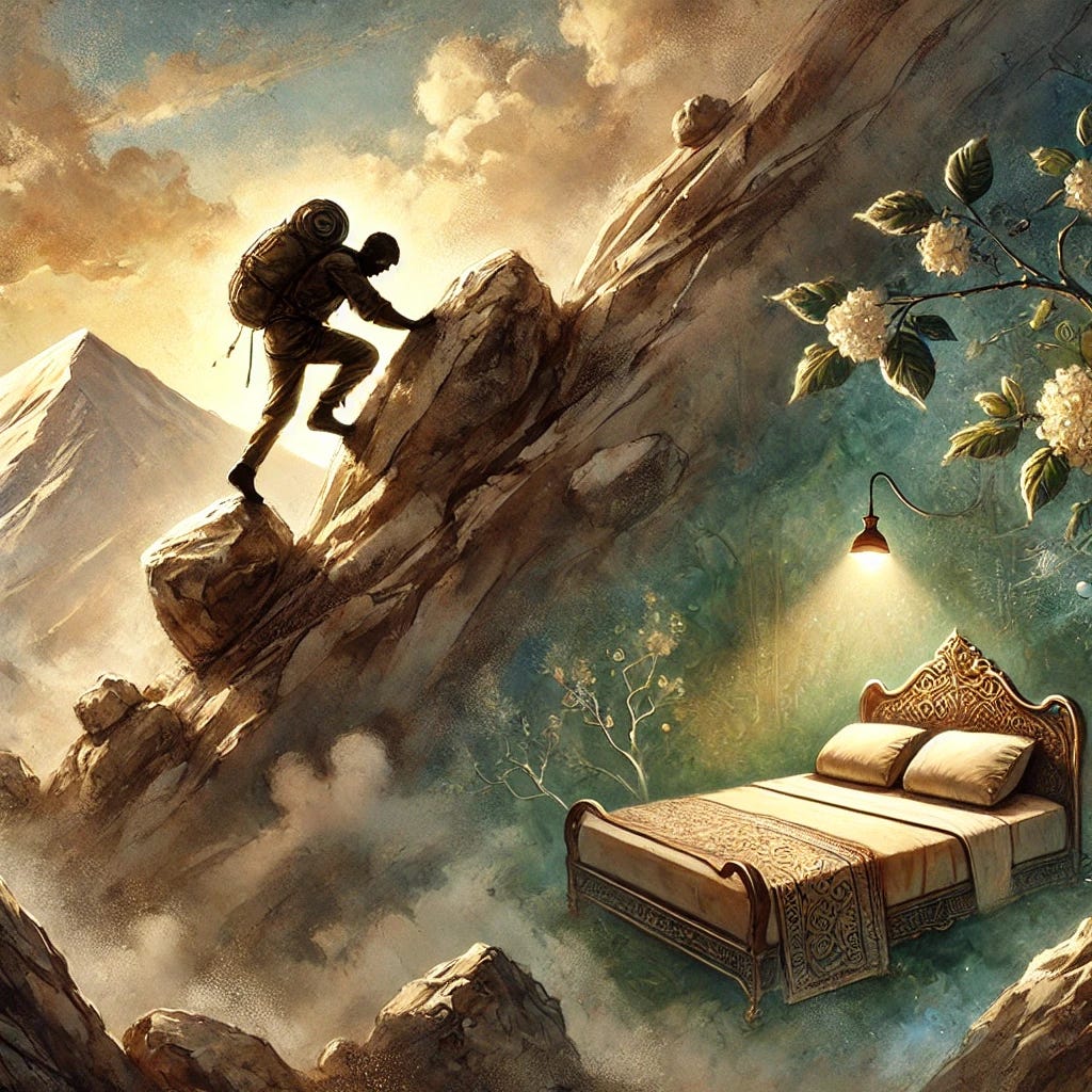 The analogy of the mountain climber is also true for the journey of man on the road to perfection.